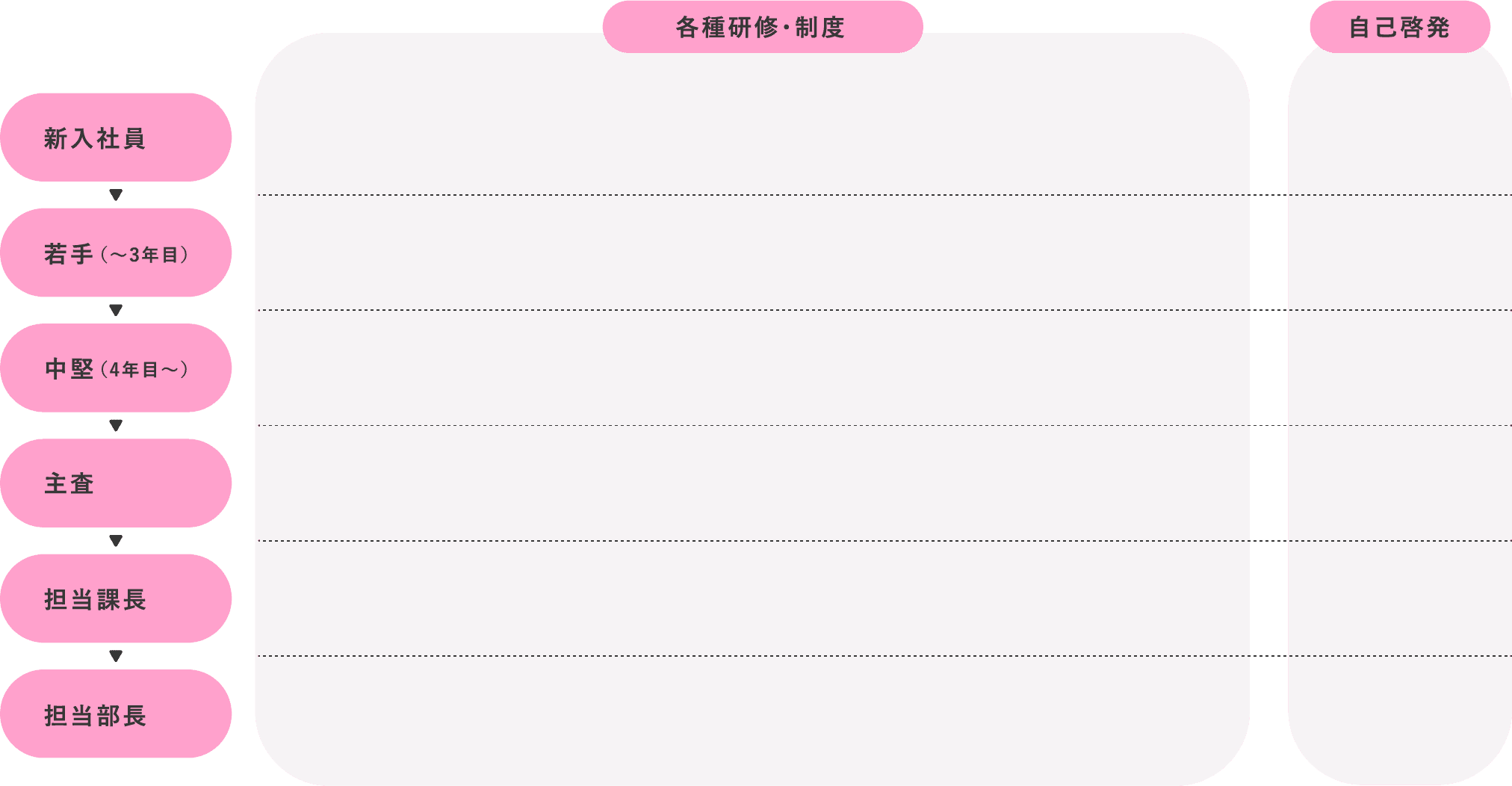キャリアアップ(階層のアップ)の前に、必要とされるスキルを修得していただきます。各階層の業務で、確実にアウトプットできるようにサポートします。