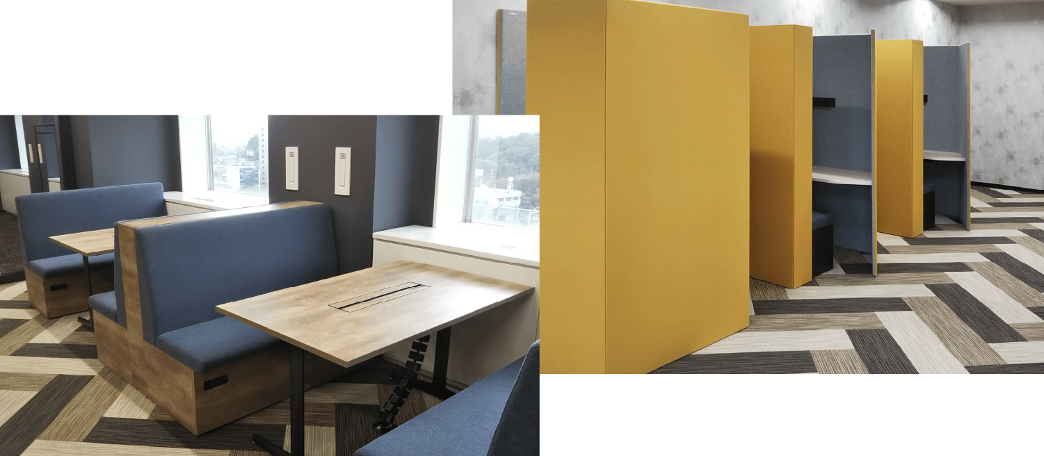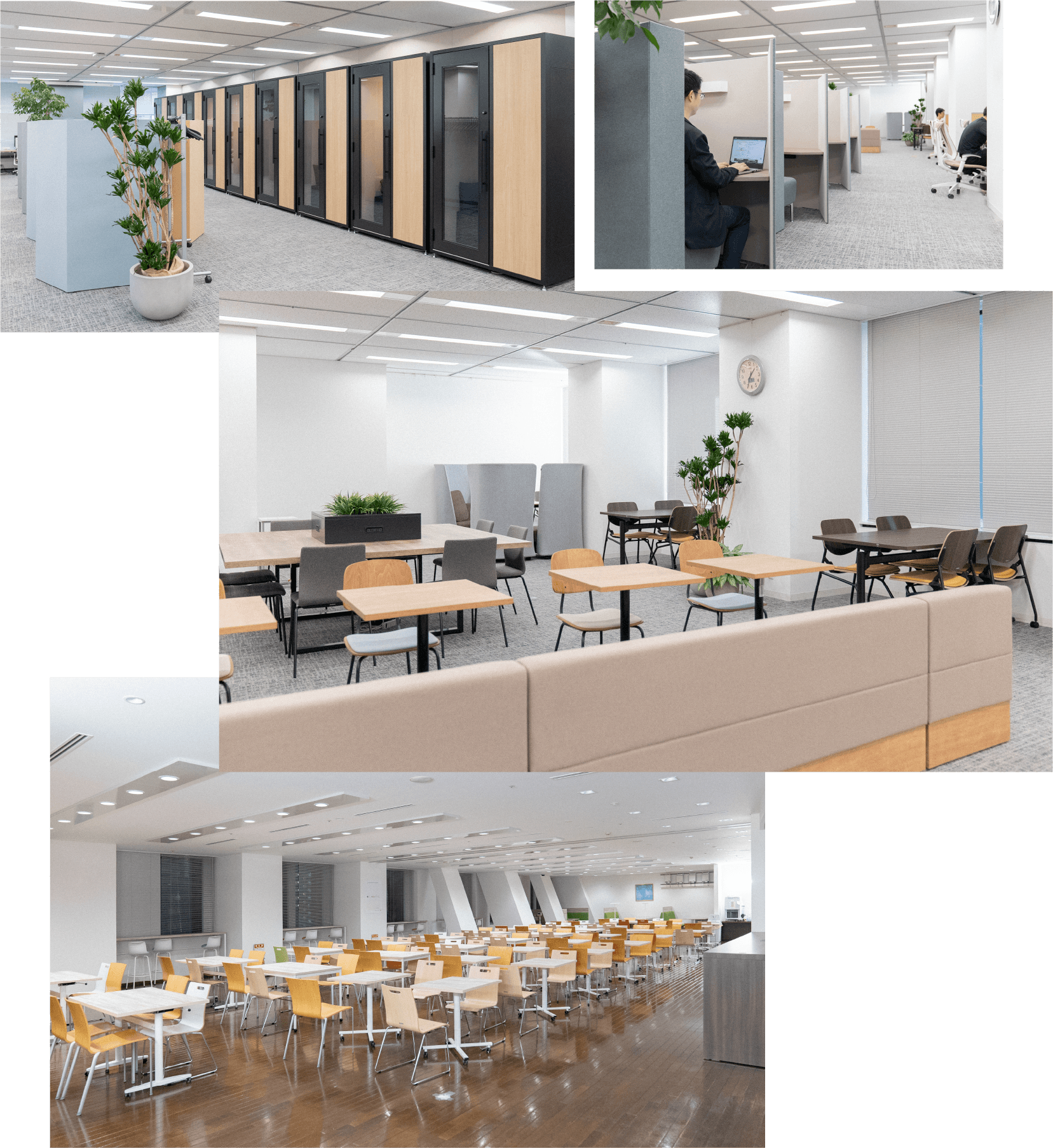 好きな席を自由に使うことができるフリーアドレス制のサテライトオフィス。集中して作業したいときには「集中ブース」「個室ブース」を利用できます。また、ランチタイムはもちろん、いつでも使える「カフェスペース」もあります。