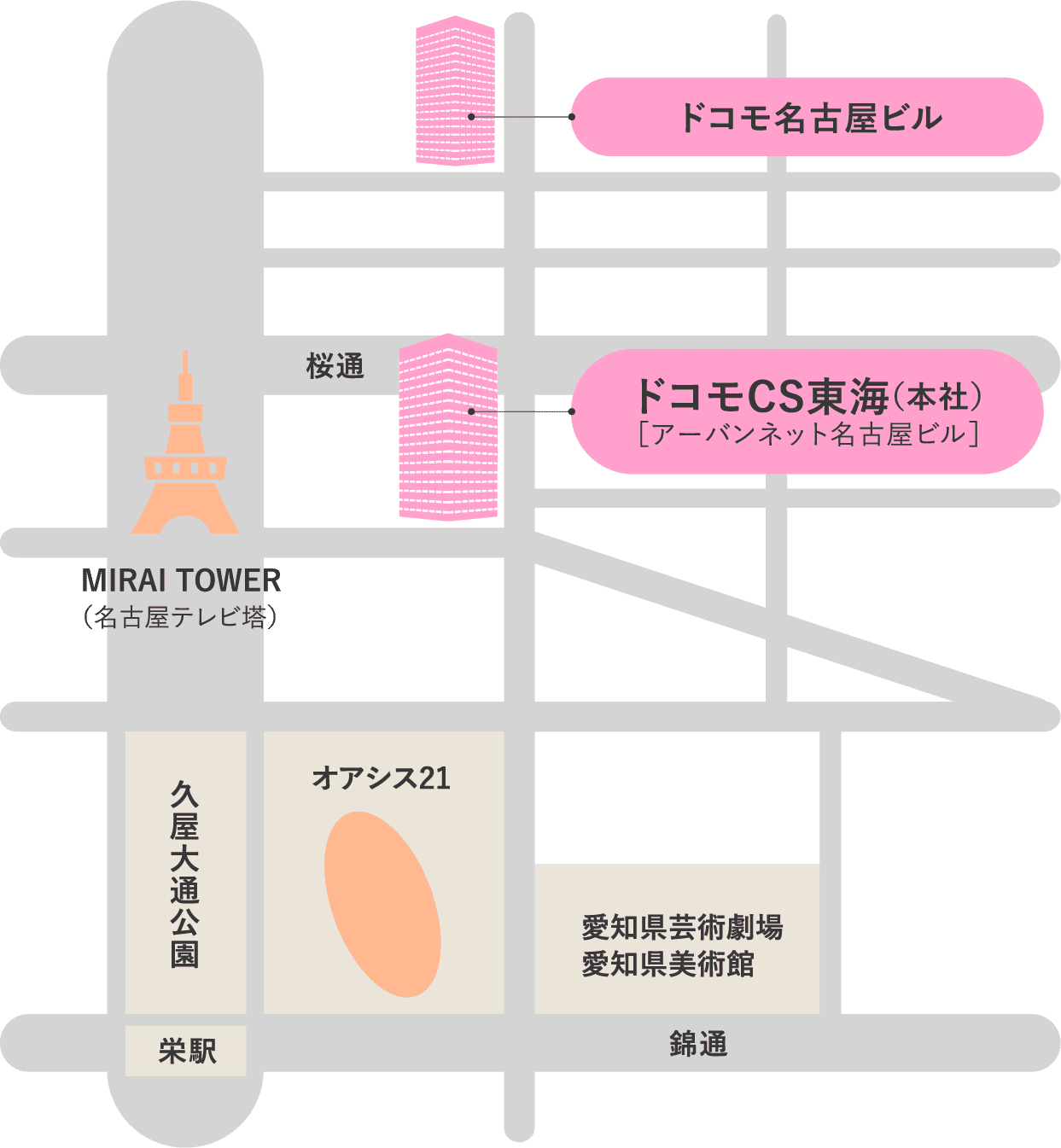 ドコモCS東海の本社が入る「アーバンネット名古屋ビル」は、名古屋の中心地栄にあります。その栄の中でもど真ん中と言える「久屋大通公園」「MIRAI TOWER」「オアシス21」のすぐ隣という抜群のロケーション。アフターファイブもいろんな楽しみ方ができる、楽しい街ですよ!