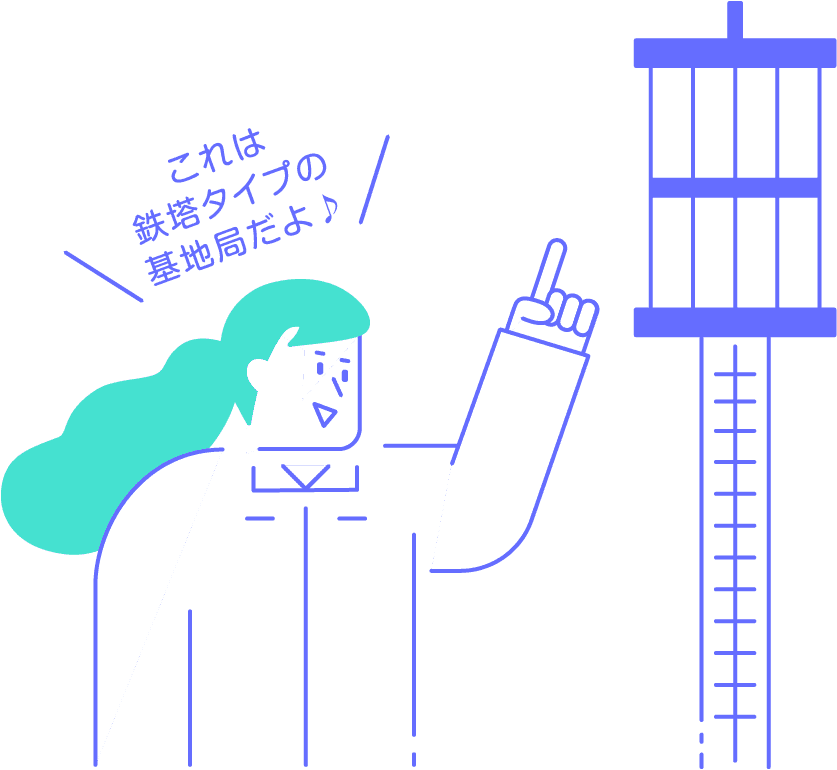約4万局※基地局は、大きく分けて「屋外型」と「屋内型」に分かれます。屋外型はさらに、おもに郊外に設置される「鉄塔タイプ」、ビルの屋上に設置される「ビル設置タイプ」。小規模なエリアをカバーするための小型・軽量の「電柱タイプ」があります。これら屋外型基地局の数を合計すると、東海4県で約4万局。膨大な数の基地局の設定を繊細に調整して、快適な通信環境を構築し、つながる安心をお客さまにお届けしています。
